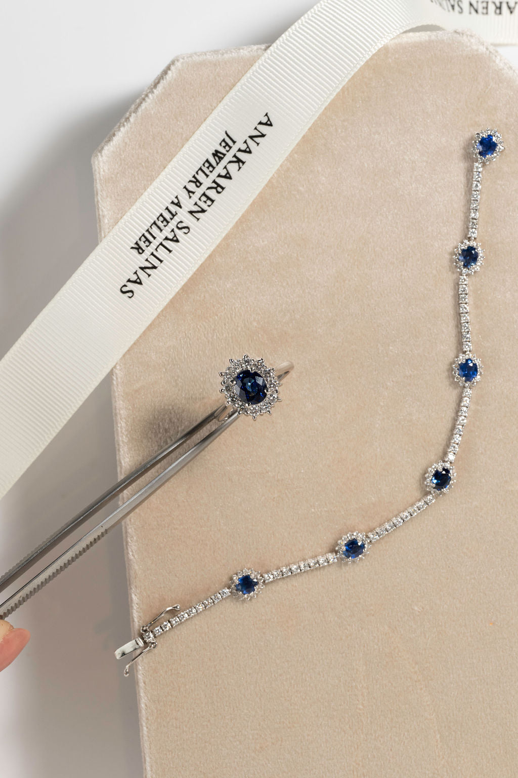 The iconic "Lady D" inspired ring with .60CT diamonds and a 1.64CT sapphire stone in 14KTS gold.